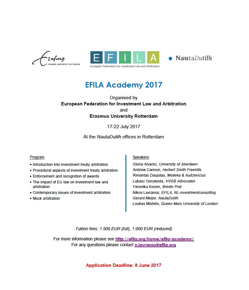 Serdecznie zapraszamy do wzięcia udziału w EFILA Investment Treaty Arbitration Academy, która odbędzie się w dniach 17-22 lipca 2017 w Roterdamie. Wydarzenie organizowane jest przez European Federation for Investment Law and Arbitration (EFILA) oraz Erasmus University Rotterdam.