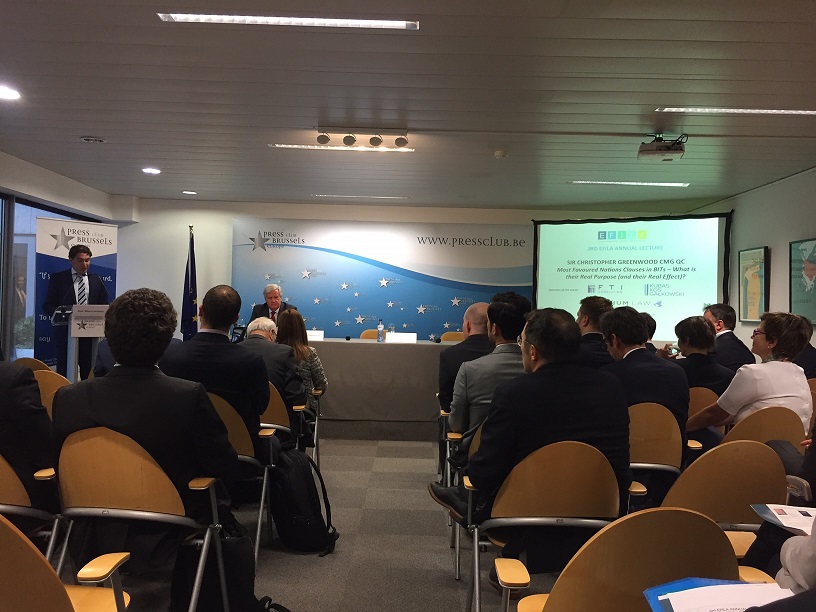 12 października 2017 roku w Brukseli odbył się trzeci Wykład Roczny EFILA Most Favoured Nations Clauses in BITs – What is their Real Purpose (and their Real Effect)?, wygłoszony przez Sir Christopher’a Greenwood’a, QC.