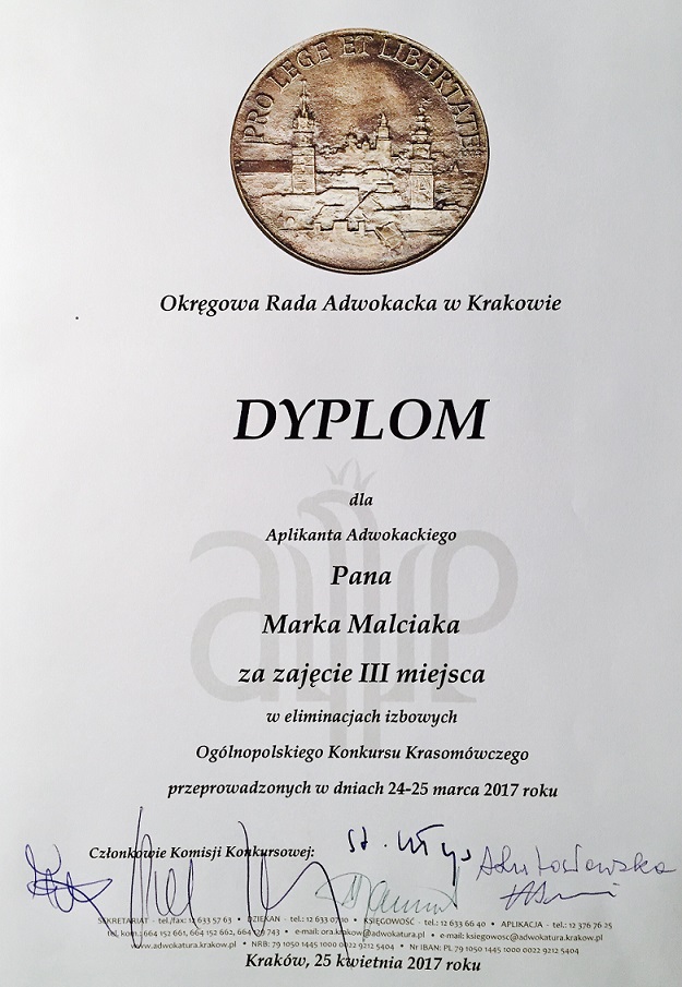 Marek Malciak, associate Kubas Kos Gałkowski, uzyskał III miejsce w eliminacjach izbowych Ogólnopolskiego Konkursu Krasomówczego Aplikantów Adwokackich im. adw. S. Mikke organizowanych przez Okręgową Radę Adwokacką w Krakowie.
