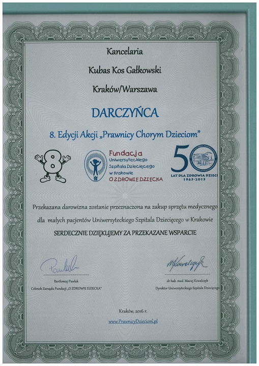 „Prawnicy Chorym Dzieciom” to akcja charytatywna, organizowana corocznie przez Fundację Uniwersyteckiego Szpitala Dziecięcego w Krakowie „O ZDROWIE DZIECKA”. Podczas projektu środowisko prawnicze angażuje się w zbiórkę pieniędzy na zakup aparatury medycznej dla Uniwersyteckiego Szpitala Dziecięcego w Krakowie. Kancelaria Kubas Kos Gałkowski również aktywnie wspiera tę inicjatywę od początku jej istnienia.